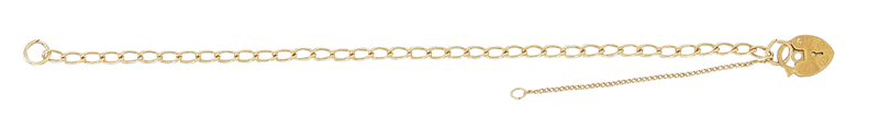 Curb link charm bracelet with heart shaped padlock and safety chain. Width: 3.20mm
