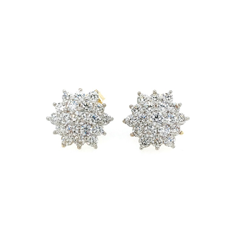 A pair of yellow gold cluster stud earring set with cubic zirconia stone. Post and butterfly closure. Width: 13.00mm Height: 13.00mm Depth: 4.00mm