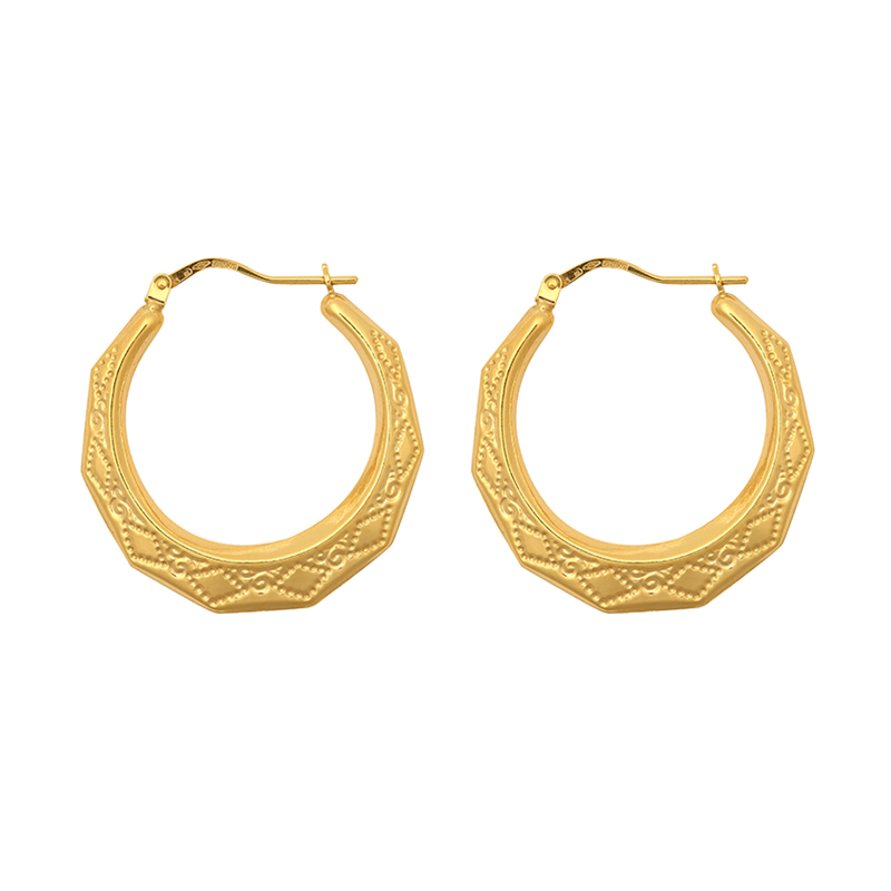 These classic creoles feature a triangular tubing and an attractive diamond shape design on the sides. Fitted with a hinged bar closure. For pierced ears only. Width: 28.00mm Height: 30.00mm Depth: 3.00mm