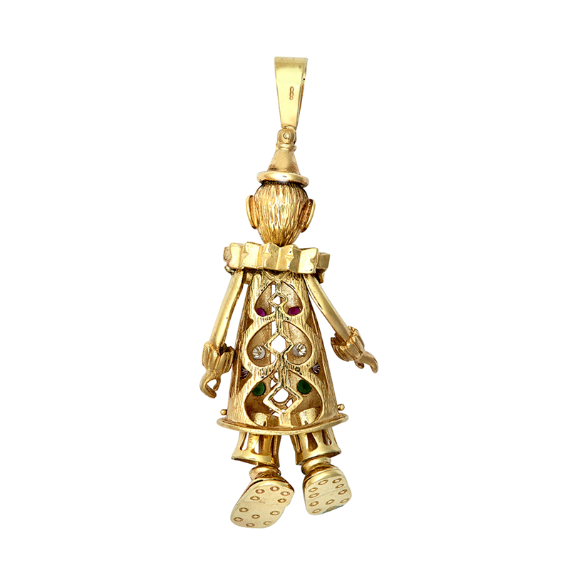 One of our original first pieces, this design has been a firm favourite for years! Fully articulated clown pendant with Moveable arm's and legs, set with multi coloured cz. Width: 20.00mm Height: 60.00mm Depth: 15.00mm