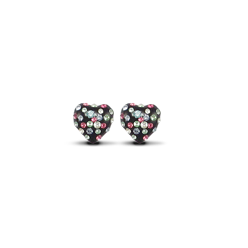 A dazzling pair of heart shaped earrings with a black background set with multicoloured sparkling crystals. For pierced ears only. Width: 10.20mm Height: 9.90mm